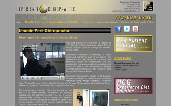 This website makes use of liberal usage of videos throughout, including testimonials and demonstrations of chiropractic techniques. A "call to action" encourages visitors to leave their contact info in exchange for a discount off a service. This information is captured in the ezDB Database to build a valuable marketing list. The client is notified when a patient contacts them, and is given valuable information including how the visitor found the website. The site also makes use of social media badges, a blog, and Click-To-Call technology.