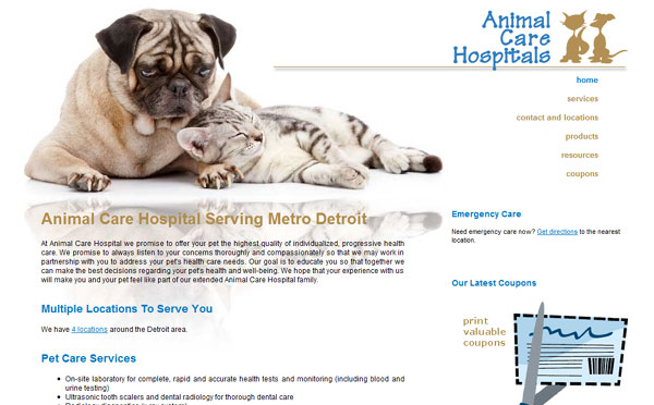 Animal Care Hospitals has four locations around metro Detroit. The main focus of the site is to quickly find and get directions to each location. The valuable coupons are dynamically displayed from the ezDB Database, allowing the company to maintain up-to-date coupons for visitors.
