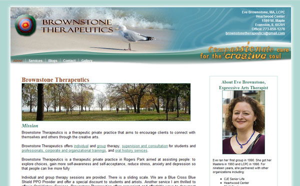 Brownstone Therapeutics is a therapeutic private practice that aims to encourage clients to connect with themselves and others through the creative arts. One invaluable service they offer is the preservation of a person's history by video-taping interviews. A vast library of videos is available on this site. In addition, patient artwork is dynamically displayed from the ezDB Database, which the client can maintain on their own.