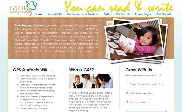 Grow Reading Solutions offers reading and writing classes to Chicagoland children in K-12th grades. The website allows parents to create a profile for their child. Then the child is administered testing directly on the site after payment if received. Once the testing is complete, GRS will recommend classes tailored to the child. Of course, the enrollment is all completed online, including payment collection.