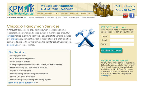 This Chicago handyman service wanted a website that they could maintain themselves, and that would be useful for their SEO marketing. It's now Search Engine Optimized and has a call to action to capture leads.