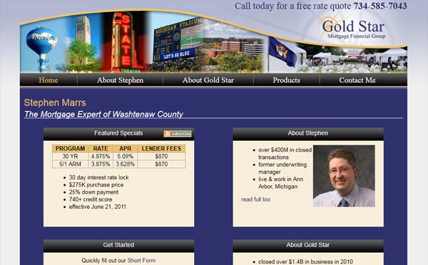 A Detroit-area mortgage consultant wanted a dual-market website--one for Michigan, the other for the West Coast. So we created two sites that differ in subtle ways, while maintaining his brand identity. Additionally, we developed a flash banner ad for display on annarbor.com that dynamically grabs the latest interest rates from his website via an xml feed. When he updates the rates on his website, they're also instantly updated in the ad.