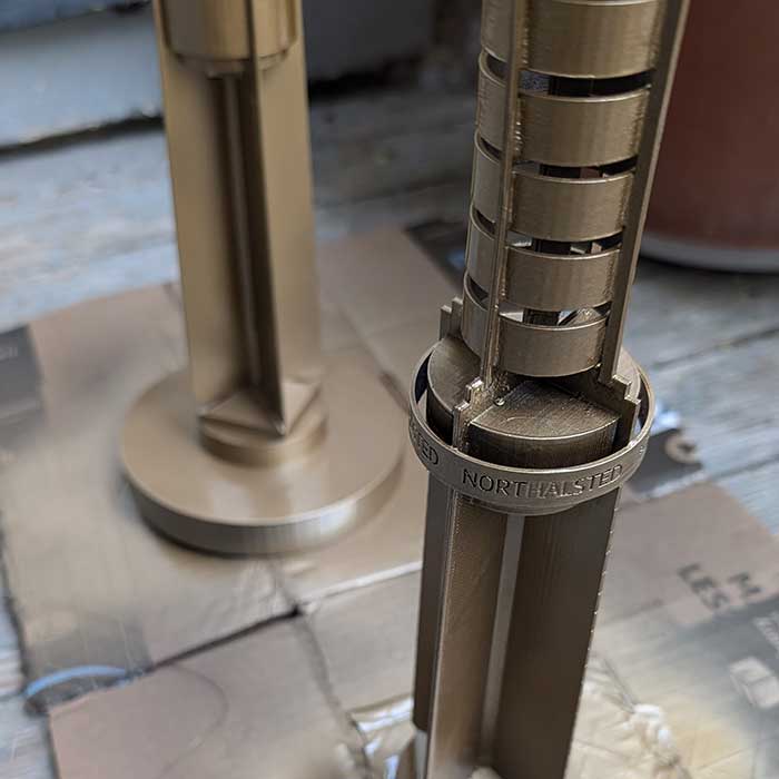 The Legacy Project, a Chicago non-profit that created the 25 foot tall pillars on the sidewalks of the Lakeview neighborhood, wanted mini versions of their pillars to use as table centerpieces for their fundraising gala. We started with very rough blueprints and created a 3D model. Next we iterated through prototypes to come up with a plan for how to assemble the pieces and streamline the production process. And finally, we printed, painted, and assembled 40 pillars, each 18" tall.