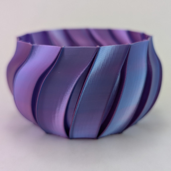 This lightweight planter/vase set is perfect for showing off a small plant or holding pencils/pens, etc. Designed and printed in Chicago, this entire planter was 3D printed with a single continuous line of filament from the bottom to the top (vase mode), resulting in a perfectly smooth and shiny surface. Plus, the dual colors change between blue and purple depending on which angle it's being viewed.